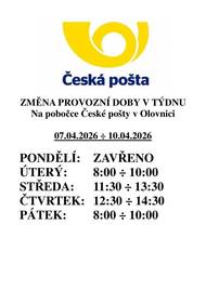 Vážení občané, v příloze naleznete otevírací dobu pobočky České pošty v Olovnici v týdnu od 07.04.2026 do 10.07.2026.