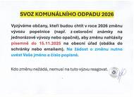 Pokud budete chtít v roce 2026 změnu vývozu popelnice (např. z celoroční známky na jednorázové vývozy nebo naopak), nahlaste změnu písemně na OÚ do 15.11.2025. Pokud změnu nežádáte, nemusíte reagovat. Bližší info na vývěskách.