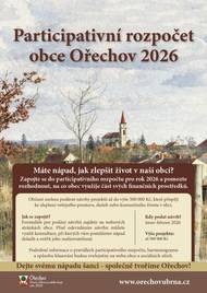Začal nám únor a Vy můžete opět podat své návrhy až do výše 500 0000 korun do Participativního rozpočtu obce. Veškeré podrobnější informace naleznete na webu https://participace.mobilnirozhlas.cz/orechov. Nevíte zda je Váš nápad vhodný? Rádi ho s Vámi probereme osobně. Neváhejte nás kontaktovat na tel. č. 603 862 864 nebo 736 537 231.
