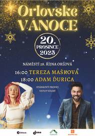 Orlovský advent se blíží do finále! V sobotu 20. prosince se můžete těšit na vystoupení české zpěvačky Terezy Maškové. Tu pak na podiu vystřídá slovenský zpěvák Adam Ďurica. 16:00 Tereza Mašková 18:00 Adam Ďurica Koncerty proběhnou na náměstí 28. října v Orlové-Lutyni. Stánkový prodej zajištěn. Kolotoč v provozu. Těšíme...