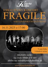 Kysucká koliba vás pozýva dňa 16. novembra 2025 na exkluzívny koncert skupiny Fragile spojený s kulinárskym zážitkom. Informácie na tel. čísle: 0948 / 470 407.