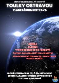 Nepropásněte možnost vydat se na první letošní Toulky Ostravou, tentokrát do Planetária Ostrava. Výlet pro seniory se uskuteční ve středu 14. ledna 2026 s odjezdem v 10:00 hodin od Kulturního domu Hrabová přistaveným mikrobusem. Přihlášky přijímáme už jen dnes – telefonicky na čísle 724 103 762 nebo osobně na radnici v kanceláři č. 15 do 14:00 hodin.