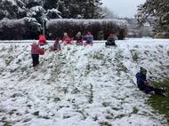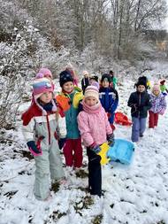 I když zatím sněhová nadílka nebyla bohatá, děti přesto s nadšením vyběhly ven, klouzaly se a postavily sněhuláka.