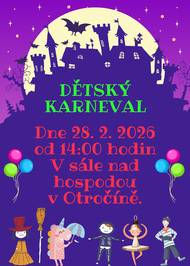 V sobotu 28.02.2026 od 14.00 hodin v sále nad hostincem v Otročíně. Zvány jsou všechny děti v maskách i bez. Připraven program, občerstvení i drobné odměny.