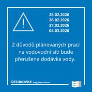 Z důvodu plánovaných prací na vodovodní síti bude přerušena dodávka vody: dne 25.02. od 8:00 do 11:00 - ul. Jabůrková, dne 26.02. od 8:00 do 11:00 - ul. tř. Osvobození, Příčná, dne 27.02. od 8:00 do 11:00 - ul. Hlavní 1249,1250, dne 04.03. od 7:30 do 17:00 - ul. Tylova, tř. Spojenců, Mánesova. Více informací na www.vodarnazlin.cz/aktuality