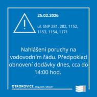 Z důvodu poruchy na vodovodním řádu byla dnes v dopoledních hodinách přerušena dodávka vody v ulici SNP 281, 282, 1152, 1153, 1154, 1171 pro cca 60 odběrných míst. Cisterna s vodou přistavena.