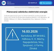 Z důvodu plánovaných prací na zařízení distribuční soustavy bude dne 16.03. od 11:30 do 14:30 přerušena dodávka elektřiny v ulici Bartošova, Bří Mrštíků, Hálkova, K. H. Máchy, Napajedelská, Nivy, Spojovací, U Farmy, Zlínská