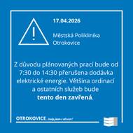 Z důvodu plánovaných prací na transformátoru VN v objektu Městské polikliniky bude v pátek 17.04. od 7:30 do 14:30 přerušena dodávka elektřiny. Většina ordinací a ostatních služeb bude tento den zavřená.