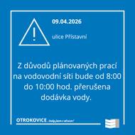 Z důvodu plánovaných prací na vodovodní síti bude dne 09.04. od 08:00 do 10:00 přerušena dodávka vody v ul. Přístavní. Více info na www.vodarnazlin.cz/aktuality