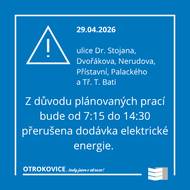Z důvodu plánovaných prací na zařízení distribuční soustavy bude dne 29.04. od 7:15 do 14:30 přerušena dodávka elektřiny v ulici Dr. Stojana, Dvořákova, Nerudova, Palackého, Přístavní a tř. T. Bati. Více info na www.egd.cz/odstavky-elektrina