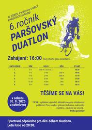 Zveme vás na tradiční 6. duatlon v Paršovicích, tentokrát k sokolovně. Začátek je od 16 hodin, pro děti jsou během akce připraveny hry a skákací hrad. Akce bude zakončena letním kinem od 20 hodin - promítat budeme Moře na dvoře.
