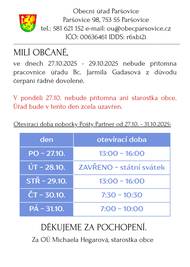 Vážení občané, informujeme vás, že ve dnech 27. až 29. října 2025 nebude přítomna pracovnice úřadu Bc. Jarmila Gadasová, která čerpá řádnou dovolenou. V pondělí 27. října bude úřad zcela uzavřen, neboť nebude přítomna ani starostka obce. Pošta bude v pondělí a ve středu otevřena od 13 do 16 hodin.