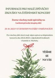 Štěpánský koncert proběhne 26. prosince 2025 v místním kostele. Všechny děti, které mají zájem se zúčastnit, prosíme, aby přišly na první informační schůzku ve středu 29. října 2025 v 17:30 na faře. Budeme se scházet jednou týdně, abychom se společně připravili na vystoupení a užili si zpívání.