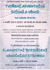 Přijďte si vytvořit krásné vánoční dekorace - svícny a věnce v neděli 30. listopadu 2025 od 16:00 do 18:00 hodin do místní hasičárny. Dozvíte se něco o historii a symbolice adventních vazeb, přičemž materiál bude k zakoupení. Slavnostní rozsvícení vánočního stromku - od 18:15 sraz u MŠ.