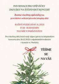 Pravidelná setkání dětské pěvecké skupiny se konají každý pátek od 17:30 do 18:30 na faře v Paršovicích od 7.11.2025. Zkoušky jsou určeny pro děti (menší i větší) a dorost, kteří se chtějí zapojit do štěpánského koncertu, který proběhne 26. prosince 2025 v odpoledních hodinách v kostele sv. Markéty.
