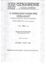 Pošta Iža - obmedzenie hodín pre verejnosť 27.10.2025 Izsai posta - korlátozott nyitvatartás 2025.10.27 - é