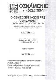 Pošta Iža - obmedzenie hodín pre verejnosť 30.10.2025, Otvorené do: 13:30 hod. Izsai posta - korlátozott nyitvatartás 2025.10.30 - án Nyitvatartás : 13:30 - ig