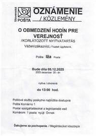 Pošta Iža oznamuje obyvateľom, že dňa 05.12.2025 bude otvorená do 13:00 hod. Za pochopenie ďakujú. Az Izsai posta értesíti a lakosságot, hogy 2025.12.05 én 13:00 ig lesz nyitva. Megértésüket köszönik.