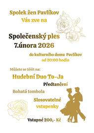 Spolek žen Pavlíkov Vás zve na Společenský ples 7. února 2026 do KD Pavlíkov od 20:00 hod.