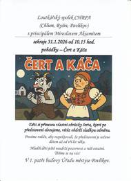 Loutkové divadlo - Čert a Káča v sobotu 31.1.2026 od 10:15 hod. Děti si přinesou vlastní obrázky čerta, které po představení slosujeme, vítěz obdrží sladkou odměnu. Prosíme rodiče, aby respektovali, že představení je určeno dětem až od tří let věku. Mladší děti ještě neudrží pozornost a ruší ostatní. Těšíme se na vás! V 1. patře budovy Úřadu městyse Pavlíkov.