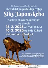 Myslivecký spolek Pavlov pořádá chovatelskou přehlídku trofejí SIKY JAPONSKÉHO v oblasti chovu "BOUZOVSKO". Přehlídka se koná ve dnech 15. 2. 2025 od 9 do 18 hod. a 16. 2. 2025 od 9 do 12 hod. v Kulturním domě v Pavlově.