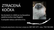 Ve čtvrtek 6. 6. 2025 se na ZAVADILCE ztratila kočka rasy Ragdoll. Má světlou barvu a výrazné modré oči. V případě nálezu nebo informací volejte na uvedené kontakty.