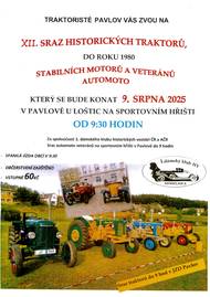 Traktoristé PAVLOV Vás srdečně zvou na XII. Sraz HISTORICKÝCH TRAKTORŮ do roku 1980, STABILNÍCH MOTORŮ a VETERÁNŮ AUTOMOTO, který se bude konat v sobotu 9. srpna 2025 v Pavlově na hřišti od 9:30 hod.