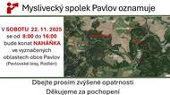 V SOBOTU 8. 11. 2025 se od 8:00 do 16:00 bude konat NAHÁŇKA v obci Pavlov. Lokality: Rodlen - Zlatý důl, Masnice, Prosova skála, Dubovice, Čechovec, Placvara, Dolečka. DBEJTE PROSÍM ZVÝŠENÉ OPATRNOSTI ve vyznačených lokalitách.
