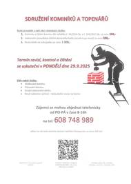 Sdružení kominíků a topenářů bude v naší obci poskytovat služby jako kontrolu a čištění komínů, čištění plynových kotlů a revize kotlů na tuhá paliva. Termín revizí a kontrol se uskuteční 18. listopadu 2025.