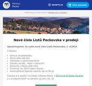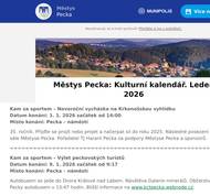 Kam za sportem – Novoroční vycházka na Krkonošskou vyhlídkuDatum konání: 1. 1. 2026 začátek od 14:00Místo konání: Pecka – náměstí 35. ročník. Přijďte se projít nebo projet a načerpat sil do roku 2025. Následné posezení s občerstvením na sále Městyse Pecka. Pořadatel TJ Harant Pecka za podpory Městyse Pecka a sponzorů. ================================================================ Kam za sportem – Výlet peckovských turistů Datum konání: 9. 1. 2026 začátek od 9:17Místo konání: Pecka – náměstí Autobusem se jede do Dvora Králové nad Labem. Návštěva Galerie minerálů. Občerstvení, oběd. Zpět do Pecky autobusem v 13:47 hodin. Bližší informace na www.kctpecka.webnode.cz. ================================================================ Kam za kulturou – Hasičský plesDatum konání: 10. 1. 2026 začátek od 20.00Místo konání: Sál hasičské zbrojnice, Pecka SDH Pecka pořádá tradiční ples, hudba pan Pacák, výborné občerstvení zajištěno, losování o zajímavé ceny. ================================================================ Kam za kulturou – Hasičský plesDatum konání: 17. 1. 2026 začátek od 20.00Místo konání: KD Kal Hudba p. Pacák, občerstvení zajištěno, bohatá tombola. ================================================================ Kam za kulturou – Sportovní plesDatum konání: 31. 1. 2026 začátek od 20.00Místo konání: Sál hasičské zbrojnice, Pecka Hudba k tanci, občerstvení zajištěno, bohatá tombola. Pořadatel TJ Harant. ================================================================ Změna programu vyhrazena. Pro návrhy, náměty, připomínky aj. pište na adresu: knihovna.pecka@seznam.cz