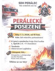 SDH Perálec Vás srdečně zve na "Perálecké posezení", 7.3.2026, od 19 hod, na sále místního pohostinství. K tanci a poslechu hraje L.Špičák a K.+P. Dostálovi, tombola, občerstvení zajištěno, vstupné 150 Kč. Těsíme se na Vás