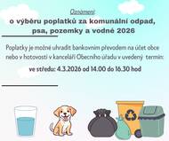 Upozornění, 4.3.2026 od 14:00 - 16:30 hodin, se budou vybírat obecní poplatky na rok 2026.