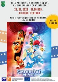 Přijďte si užít pohádkové filmové dobrodružství se ŠMOULY. 💙 Čeká vás spousta smíchu , napětí i kouzelných šmoulích momentů. Vezmi kamarády, rodiče i sourozence, pohodlně se usaď a nech se vtáhnout do světa, kde je všechno tak trochu modré! Kino za vysvědčení pro děti: 📅 29. 1. 2026 v 17.00 hodin 📍 Kulturní centrum Petrovice u Karviné 💙 VSTUP ZDARMA Těšíme se na všechny malé (i velké) Šmouly!