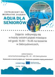 Obec Zebrzydowice zve seniory na lekce plavání. Lekce se konají vždy poslední pátek v měsíci od 15.00 do 15.45 hod. Počet míst je omezen. Rezervujte si své místo na telefonu 725 915 687 nebo 607 515 986. Lekce se uskuteční v rámci projektu „Sousedská setkání napříč generacemi“ / „Spotkania sąsiedzkie między pokoleniami“, číslo projektu: Z.11.04.02/00/23_003/0000151, který je finančně podpořen Evropskou unií z programu Interreg Česko–Polsko