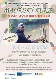 Obec Petrovice u Karviné zve své občany a občany Zebrzydowic na jedinečný malířský kurz pod vedením malíře Václava Buchtelíka. Kurz je určen pro každého – ať už s malováním teprve začínáte, nebo už máte nějaké zkušenosti a chcete se dále rozvíjet. Nemusíte si dělat starosti ani s nákupem vybavení, protože veškeré výtvarné pomůcky pro vás budou připraveny přímo na místě. V ceně kurzu je navíc zahrnuto drobné občerstvení a společné závěrečné setkání všech účastníků. Kurz bude probíhat každý čtvrtek od 16.00 hod. V termínu od 9. 4. do 11. 6. 2026 v Kulturním centru. Cena kurzu je 1 000 Kč. Počet míst je omezen, rezervujte si své místo do 6. 3. na tel. č.: +420 725 915 687 nebo na adela.topolcanova@petroviceuk.cz.