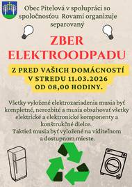 Obec Pitelová v spolupráci so spoločnosťou ROVAMI organizuje separovaný zber elektronického odpadu. Zber sa uskutoční dňa 11.03.2026 (streda) od 08:00 hod. V čase do 08:00 hodiny si vyneste pred dom staré nepotrebné elektrické a elektronické zariadenia.