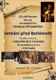 🎄 ZŠ a MŠ Plavsko vás srdečně zve na vánoční divadelní představení! 🎭✨ Do Plavska zavítá Divadlo Víti Marčíka se svou krásnou vánoční hrou: 🌟 Setkání před Betlémem 📅 10. prosince (středa) 🕤 v 9:30 hodin 📍 Obecní sál v Plavsku Přijďte se společně naladit na adventní atmosféru a prožít poutavý příběh plný lidskosti, víry a poetiky, kterou je Divadlo Víti Marčíka proslulé. 🎫 Vstupné: 100 Kč / osoba Těšíme se na vás!