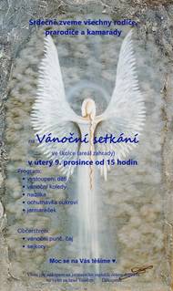 Letos již tradičně se koná VÁNOČNÍ SETKÁNÍ 9.12. od 15:00 v areálu MŠ. Můžete se těšit na vystoupení dětí, jarmareček, sejkory a punč. Těšíme se na Vás.