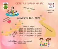 Od 12. ledna 2026 se otevírá dětská skupina, kterou bude provozovat Rodinné centrum Maják, na adrese U Školky 579, Tanvald. Přihlášky u paní Lenky Harcubové na tel. č. 739054465.