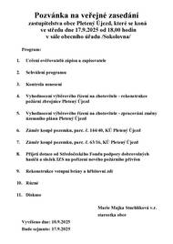 Pozvánka na veřejné zasedání zastupitelstva obce Pletený Újezd, které se koná ve středu dne 10.12.2025 od 18,00 hodin v sále obecního úřadu /Sokolovna/ Program: 1. Určení ověřovatelů zápisu a zapisovatele 2. Schválení programu 3. Kontrola usnesení 4. Stanovení výše stočného na rok 2026 5. Obecně závazná vyhláška obce Pletený Újezd o místním poplatku za odkládání komunálního odpadu z nemovité věci 6. Ceny za pronájem popelnic na BIO odpad na rok 2026 7. Rozpočet obce na rok 2026 8. Střednědobý výhled rozpočtu obce na roky 2027 - 2028 9. Dodatky ke smlouvám o sběru odpadu s AVE Kladno s.r.o. 10. Dodatek Kupní smlouvy – Pletený Újezd – přívěs pro hašení 11. Řád veřejného pohřebiště 12. Výstavba kanalizace U Křížku 13. Omezení používání pyrotechniky - informace 14. Různé 15. Diskuse Marie Majka Stuchlíková v.r. starostka obce