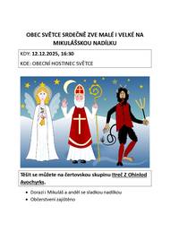 Obec Světce srdečně zve dne 12.12.2025 od 16:30 do obecního hostince Světce, kde bude probíhat Mikulášská nadílka. Vystoupí Itreč Z Ohinlod Avochyrks, čertovská skupina, která mimo jiné v letošním roce vystupuje i na Krampuslauf v Českých Budějovicích. Pro děti připravena nadílka, občerstvení zajištěno.