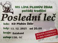MS Lípa Pluhův Žďár vás srdečně zve na "Poslední leč", která se bude konat dne 13.12.2025 od 20 hod. v KD Pluhův Žďár. K tanci a poslechu hraje skupina Balaband. Bohatá zvěřinová a jiná tombol zajištěna. Vstupné 150,- Kč.