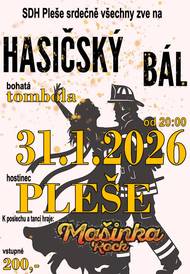 SDH Pleše srdečně zve na hasičský bál, který se koná 31.1.2026 od 20 hod. v sále hostince v Pleších. K tanci a poslechu hraje Mašinka rock. Bohatá tombola zajištěna. Vstupné 200,- Kč