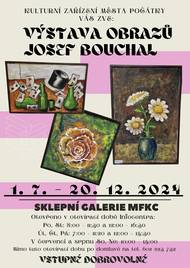 Kulturní zařízení města Počátky Vás zve na VÝSTAVU OBRAZŮ JOSEF BOUCHAL. Sklepní galerie MFKC. Výstava je přístupná od 1. července do 20. prosince 2024 a to v otevírací době Infocentra: Po, St: 8:00 - 11:30 a 12:00 - 16:30 Út, Čt, Pá: 7:00 - 11:30 a 12:00 - 15:30 V červenci a srpnu i víkendy So, Ne: 10:00 - 15:00 Mimo tuto otevírací dobu po domluvě na tel. 602 223 732. Vstupné dobrovolné.