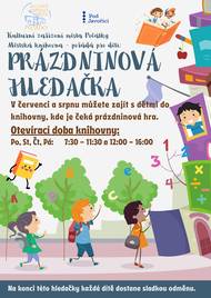 Kulturní zařízení města Počátky a Městská knihovna Počátky Vás zvou všechny děti na: PRÁZDNINOVÁ HLEDAČKA. V červenci a srpnu můžete zajít s dětmi do knihovny, kde je čeká prázdninová hra. Otevírací doba knihovny: Po, St, Čt, Pá: 7:30 - 11:30 a 12:00 -16:00 Na konci této hledačky každé dítě dostane sladkou odměnu.