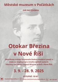 Městské muzeum Počátky zve všechny na výstavu Otokar Březina v Nové Říši. Básníkova tvorba formovala českou moderní poezii a stala se inspirací pro mnoho dalších autorů. Všechny sbírky napsal Březina právě v Nové Říši. 3. 9. - 28. 9. 2025. Vstupné 10 Kč. tel. 561 034 927, e-mail: muzeum@pocatky.cz, web: www.mestskemuzeumpocatky.cz