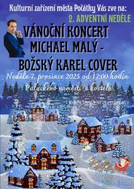 Kulturní zařízení města Počátky Vás zve na 2. ADVENTNÍ NEDĚLE: VÁNOČNÍ KONCERT VÁNOČNÍ KONCERT MICHAEL MALÝ - BOŽSKÝ KAREL COVER Palackého náměstí u kostela Neděle 7. prosince 2025 od 17:00 hodin OBČERSTVENÍ ZAJIŠTĚNO!