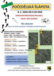 V Počedělicích se v sobotu 8. května 2026 od 9:30 hodin koná Počedělská šlápota. Účastníci si mohou vybrat z tří okruhů – 7,5 km, 11 km a 17 km. Start a cíl všech tras je před hostincem v Počedělicích. Zveme srdečně všechny sportovce, nesportovce i pomocníky při organizaci a pohoštění:)