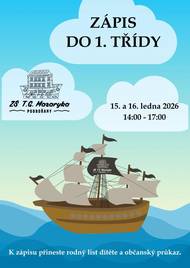 Ve dnech 15.01.2026 a 16.01.2026 od 14:00 do 17:00 proběhnou na ZŠ T.G.Masaryka Podbořany, Husova 445 zápisy do 1. třídy.