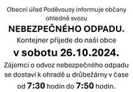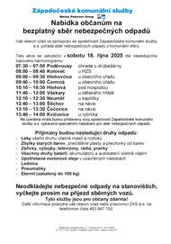 Obecní úřad ve spolupráci se Západočeskými komunálními službami a.s. pořádá sběr nebezpečných odpadů, který se uskuteční v sobotu 18. října 2025. Na několika stanovištích budou přistaveny vozy s nádobami pro sběr různých druhů nebezpečných odpadů, jako jsou léky, staré barvy, zářivky, baterie...